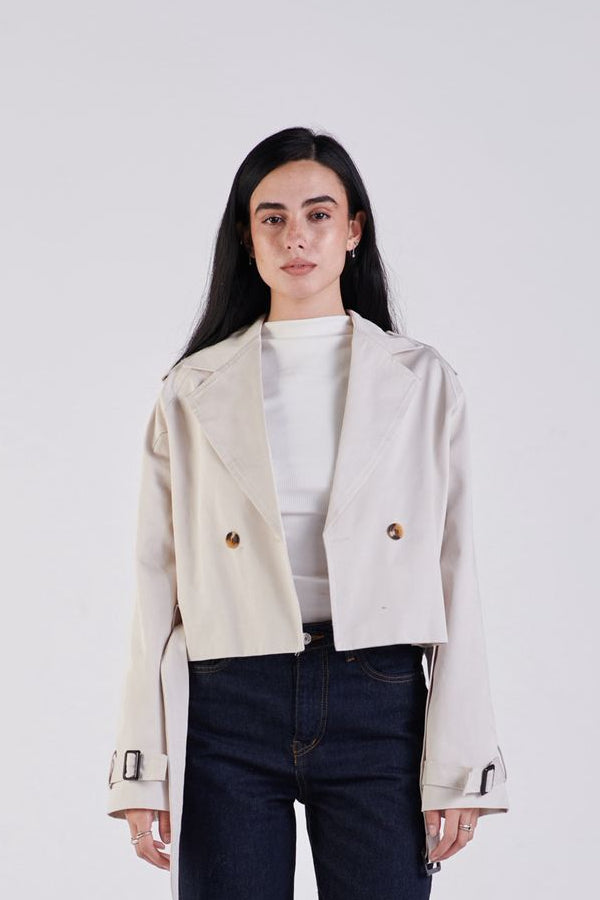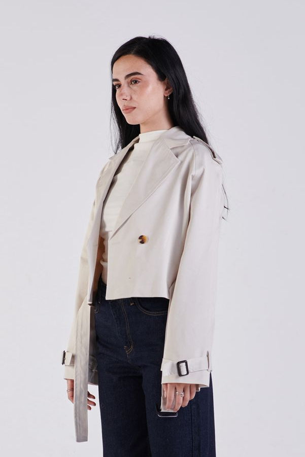 Stay effortlessly chic with this modern cropped trench coat. Designed with a relaxed fit, statement lapels, and adjustable cuff buckles, it blends classic trench details with a contemporary edge. Lightweight, versatile, and perfect for layering over your everyday looks. Finished with a single-button front and an elongated belt for added style.