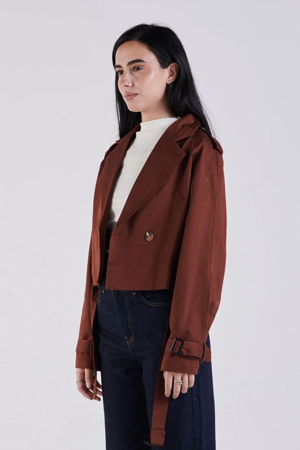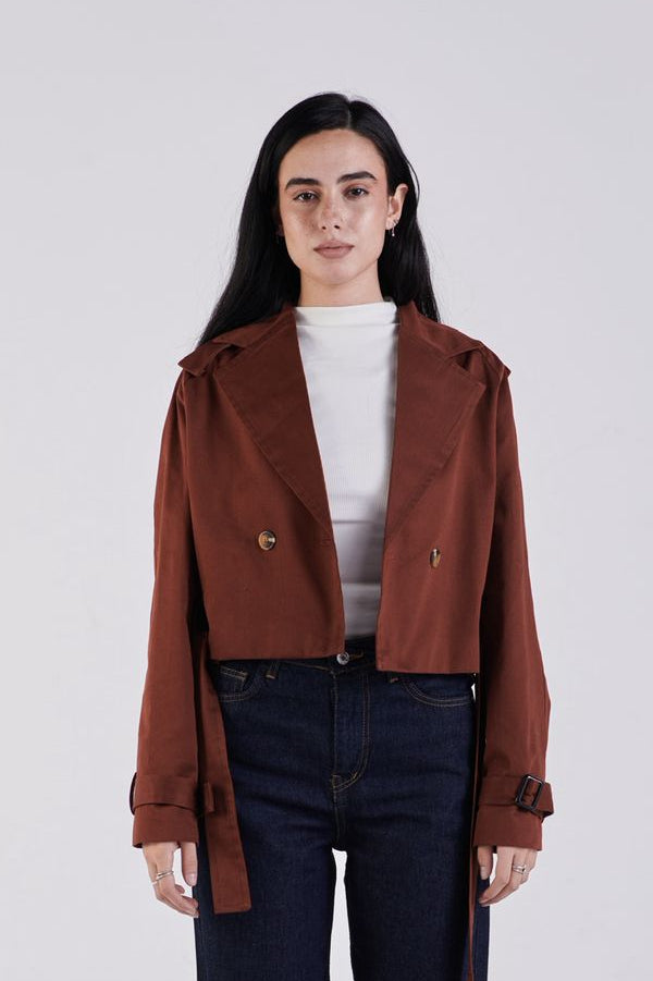 Stay effortlessly chic with this modern cropped trench coat. Designed with a relaxed fit, statement lapels, and adjustable cuff buckles, it blends classic trench details with a contemporary edge. Lightweight, versatile, and perfect for layering over your everyday looks. Finished with a single-button front and an elongated belt for added style.